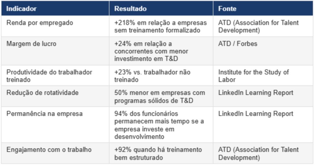 A Association for Talent Development (ATD), uma das principais organizações de pesquisa em desenvolvimento humano dos Estados Unidos, demonstrou que empresas com programas de treinamento abrangentes apresentam: