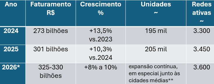 - Unidades: Houve crescimento de cerca de 5% no número de operações, com maior penetração em cidades médias e interior.